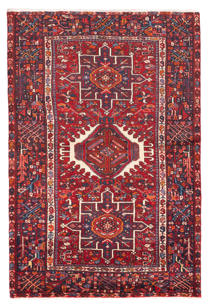 Gharadjehs are easily recognizable from their design, which consists of three medallions. The two side medallions are the same size as each other and of the same colour as the field. The central medallion is larger and of a different colour, mostly dark blue. The two side medallions resemble the eight-pointed star in shape, while the central one is diamond-shaped, often with an outline of running-dog motifs. The internal decoration of the medallion is completed by geometric plant motifs.